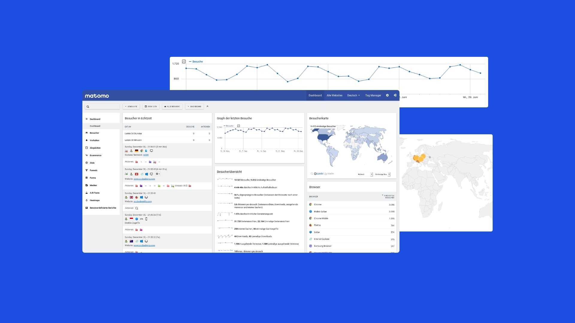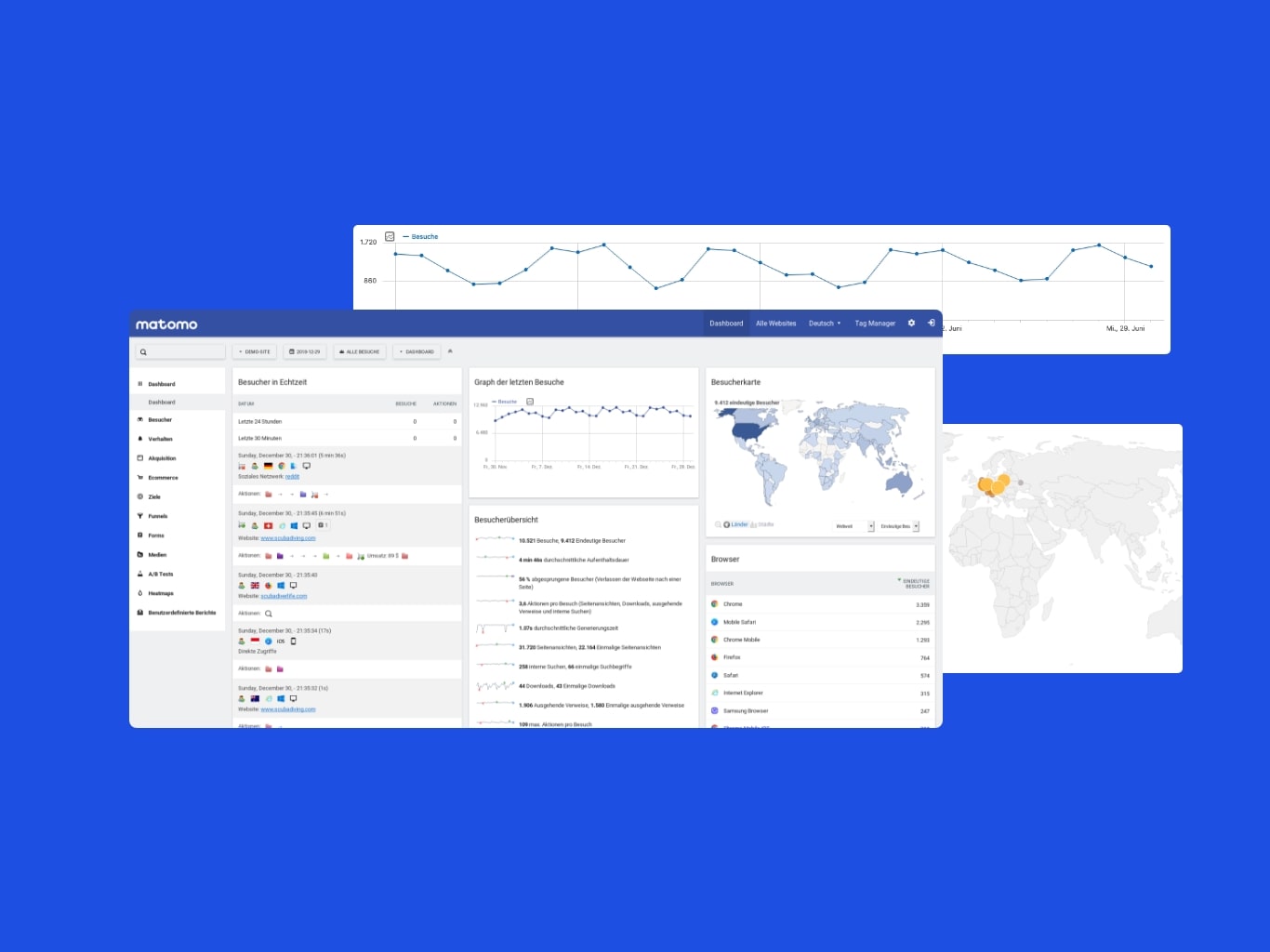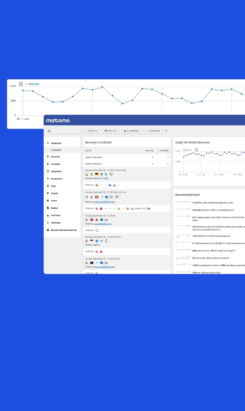 Nebenbei bietet Matomo den zusätzlichen Vorteil, dass die Datenhoheit bei Ihrem Unternehmen liegt. Dies ist in der Form besonders, da kaum ein anderer Anbieter die Datenhoheit der Firma übergibt – zum Beispiel halten Google, Facebook und Co. die Datenhoheit über alle erzielten Tracking-Werte stets firmenintern. Durch die vollständige Datenverwaltung bietet sich Matomo auch ideal dafür an, als Tracking-Software im Intranet eingesetzt zu werden. Hierdurch bleiben Ihre Unternehmensdaten bei Ihnen.