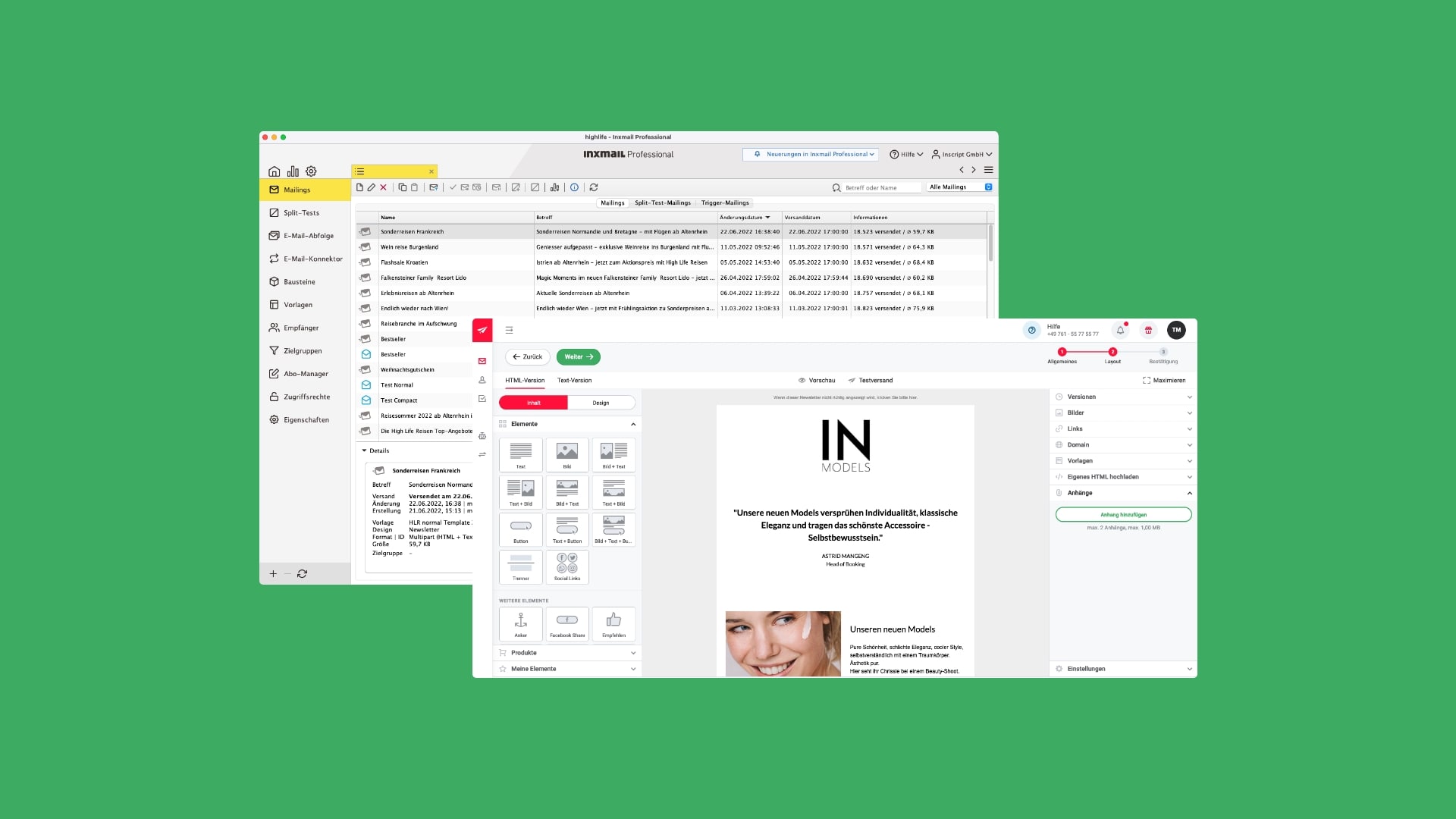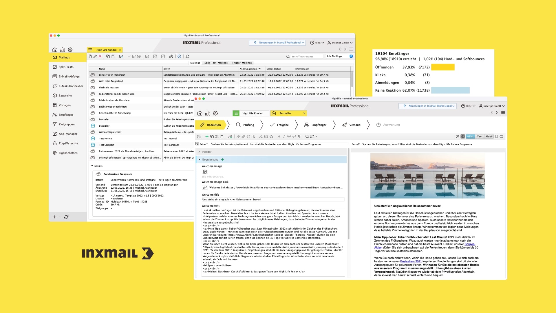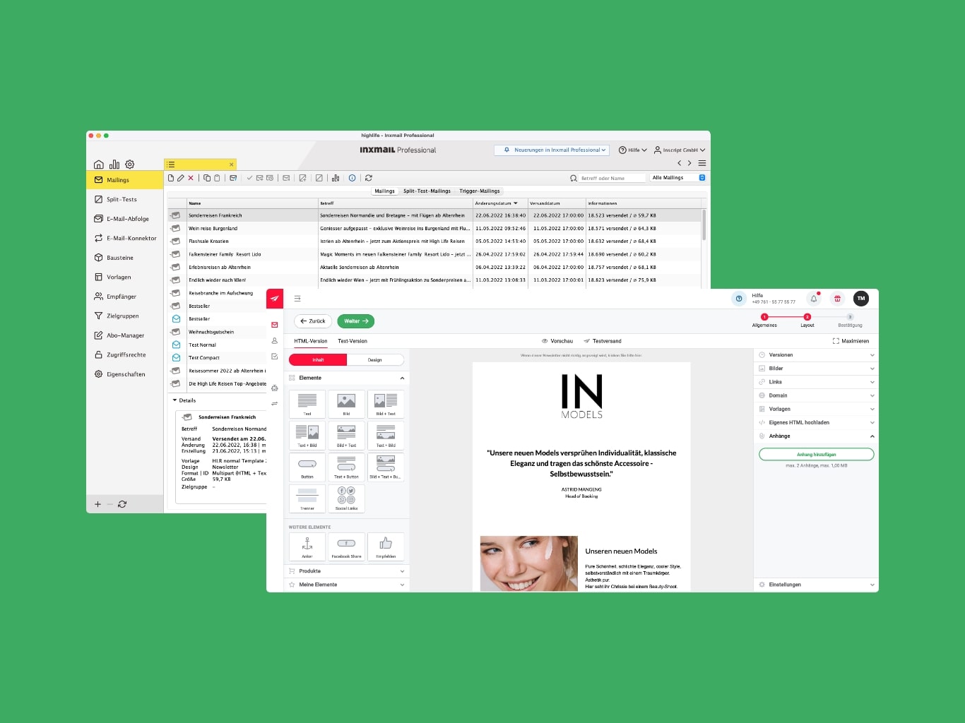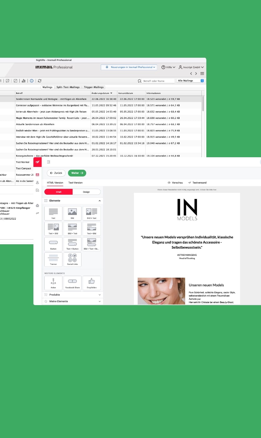 Inxmail ist der High-Professional-Anbieter auf dem deutschen Markt, vom CD-konformen Newsletterversand mittels Templates bis hin zur API-Anbindung an ein E-Commerce- oder Website-System ist alles möglich. Vorteile bietet insbesondere die eigens für Inxmail verwendete Sub-Versand-Domain. Inxmail speichert alle Daten DSGVO-konform innerhalb von Deutschland.