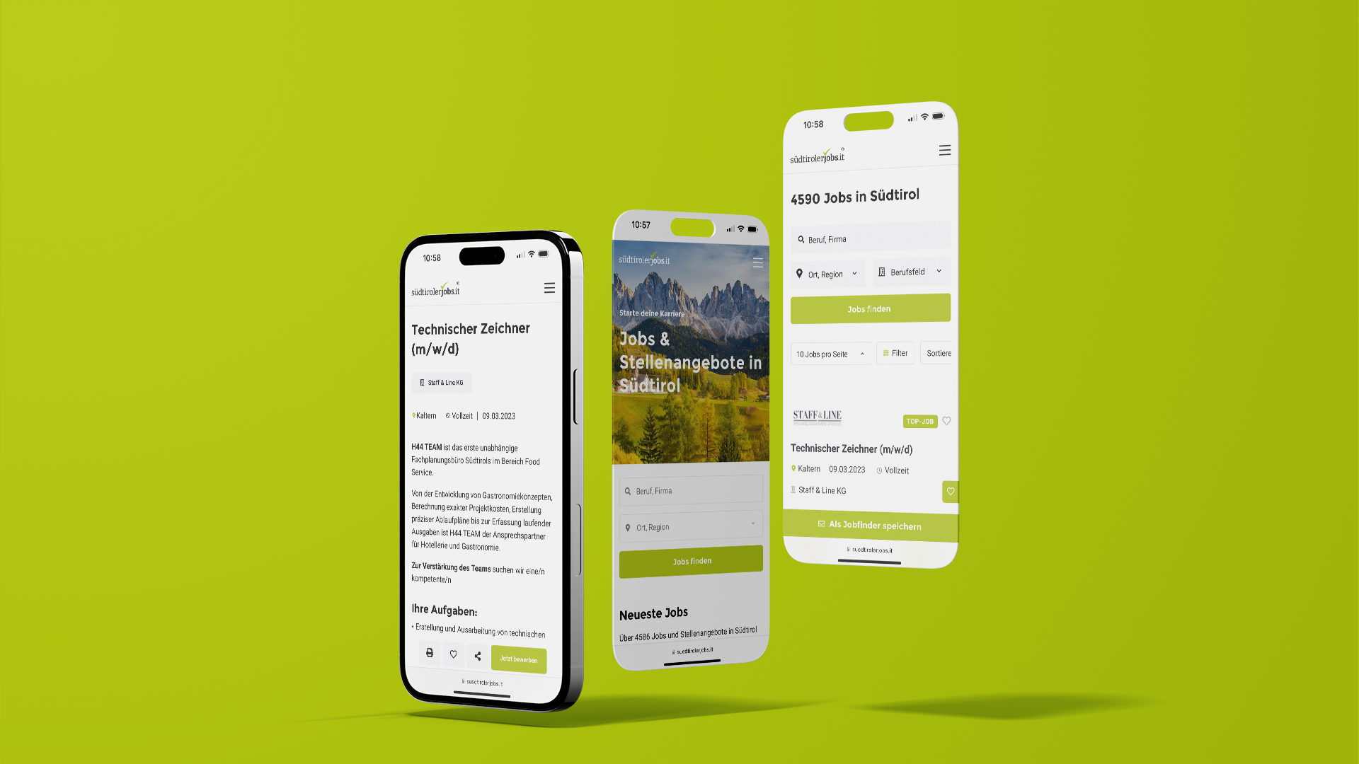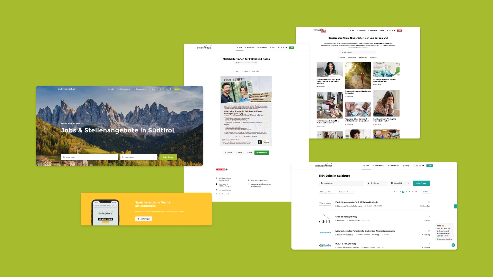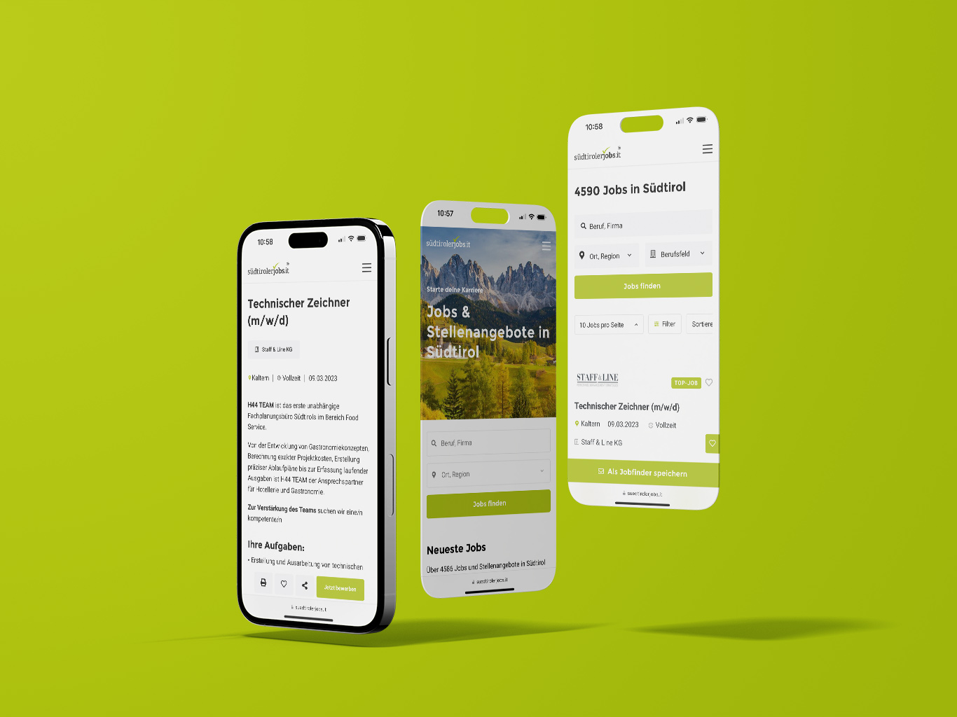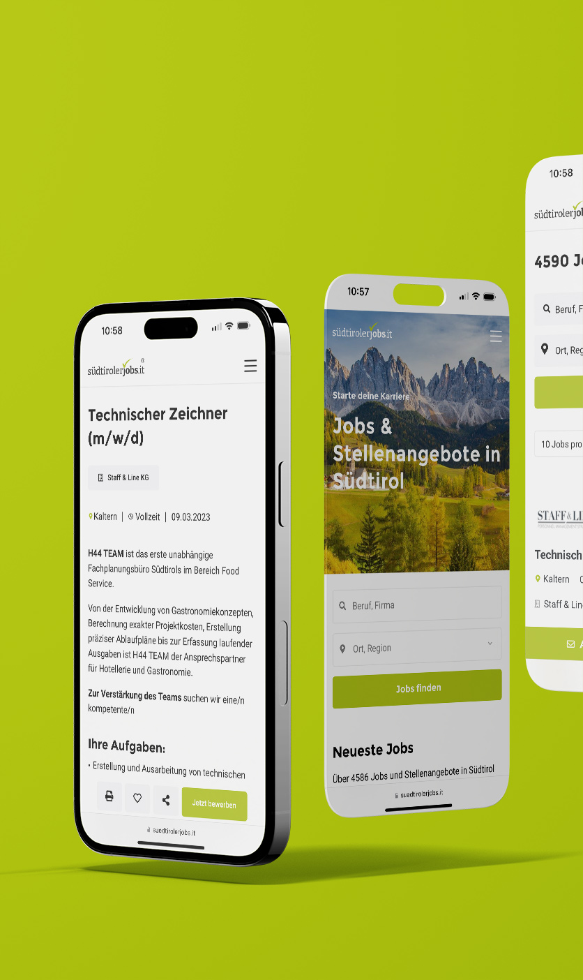 Wir starteten den Konzeptions-Prozess mit einer User Interface Design-Analyse, um gezielt mögliche Stopper in der User Journey zu identifizieren. Dies half uns enorm in der Ausrichtung des neuen Design-Konzeptes, mittels welchem wir sowohl die User Experience als auch das Interface Design auf ein noch besseres Level bringen konnten. Wir reduzierten die grafische Darstellung, indem wir die Farbgebung fokussierten, um so den Stellenangeboten und Firmen eine noch höhere Gewichtung zu geben. Zusätzlich war der farbliche Fokus besonders wichtig im Hinblick auf das Interface Design der Navigations-Struktur. Durch die klare Abtrennung der Farben sowie die Anpassung der Schriftgrößen und Elemente findet sich der User noch besser zurecht. Angesichts der breit gefächerten Zielgruppen der Job-Portale ist eine leichte, intuitive Bedienbarkeit besonders wichtig.