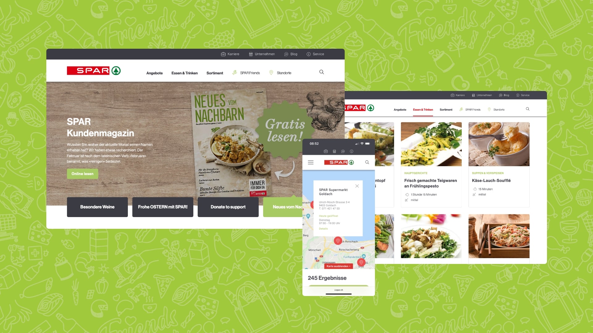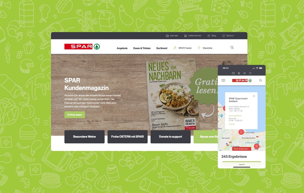 Dreimal durften wir während der letzten Jahre den Website-Relaunch von SPAR Schweiz durchführen. Step by Step ist der Umfang und Anspruch der SPAR-Website mit jedem Relaunch erneut gewachsen. So wirkt die ursprüngliche Website verglichen mit der heutigen Page sehr rudimentär. Die im Jahr 2021 neu umgesetzte Website ist gleichzeitig der Informations-Hub und die Schnittstelle zu zahlreichen weiteren Anwendungen. Deshalb war die Wahl des richtigen CMS für uns ausschlaggebend. Die Wahl fiel heute wie damals auf TYPO3, eines der sichersten und multifunktionalsten CMS-Systeme. Es ermöglicht die Anbindungen an zahlreiche Systeme und liefert die Möglichkeit die Informationen auf allen Kanälen up to date zu halten.